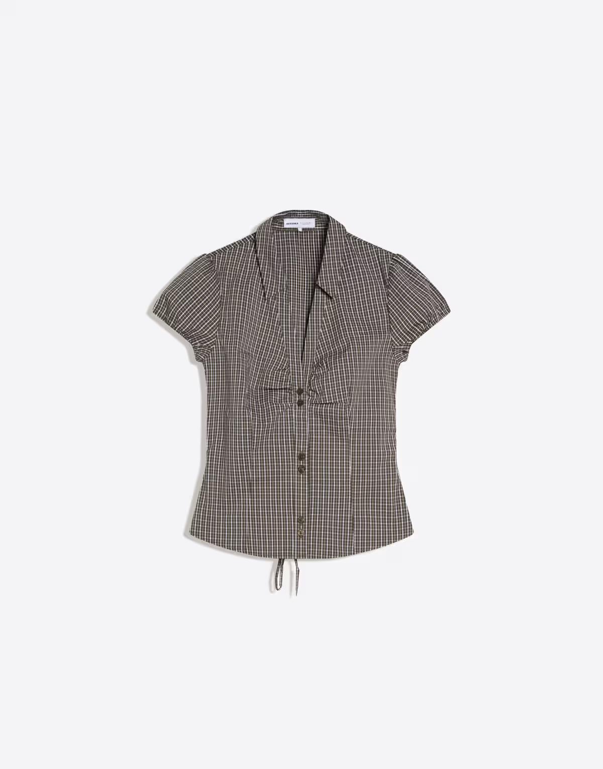 Bershka Short sleeve poplin shirt with bow in khaki