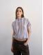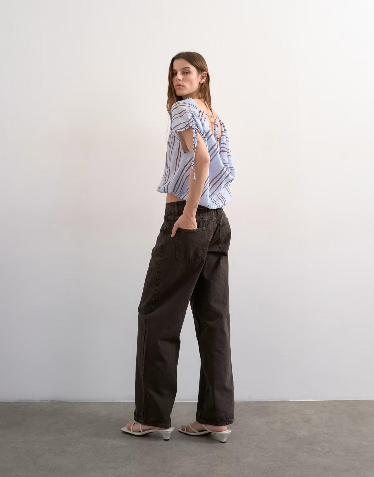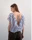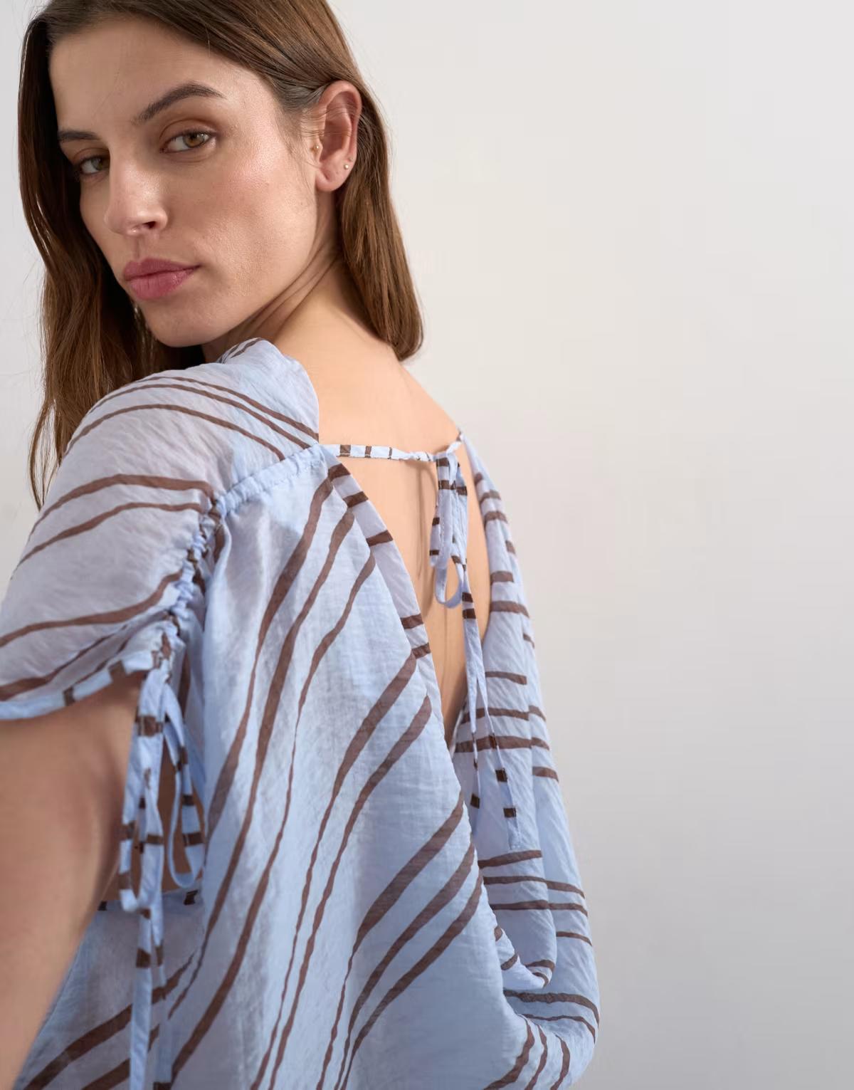 This top is crafted from a sheer fabric in a striped pattern. It features a high neck, open back, tie fastening and is cut with a regular fit.